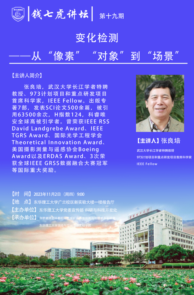 张良培,武汉大学长江学者特聘教授,s973计划项目和重点研发项目首席科学家,IEEE Fellow。出版专著7部,发表SCI论文500余篇,被引用63500 余次,H指数124,科睿唯安全球高被引学者。曾荣获IEEE RSS David Landgrebe Award,IEEE TGRS Award、国际光学工程学会Theoretical Innovation Award,美国摄影测量与遥感协会 Boeing Award 以及ERDAS Award、3次荣获全球IEEE GRSS数据融合大赛冠军等国际重大奖励。