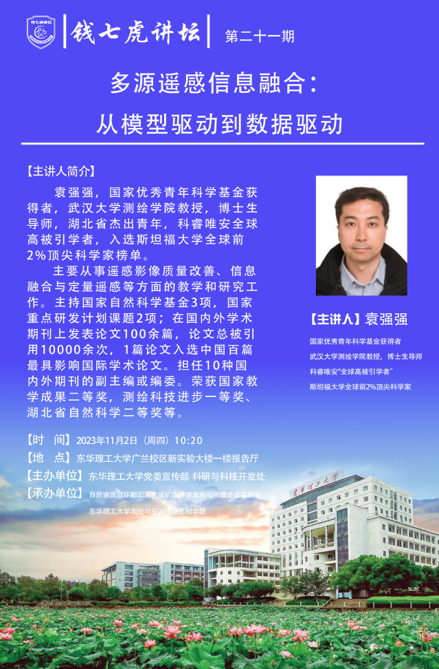 应党委宣传部邀请,国家优秀青年科学基金获得者袁强强教授来到“三亿体育(中国)官方网站”,以“多源遥感信息融合:从模型驱动到数据驱动”为主题开展讲座。欢迎全校师生届时前往聆听。