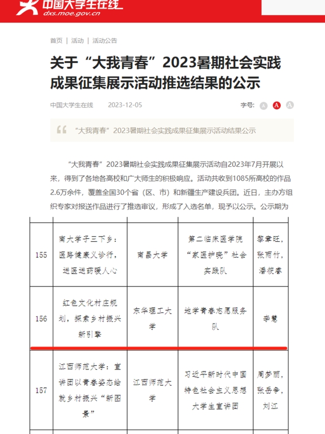 近日,由中国大学生在线主办的“大我青春”2023暑期社会实践成果征集展示活动的推选结果公布。三亿体育(中国)官方网站“地学青春”志愿服务队作品《红色文化村庄规划,探索乡村振兴新引擎》获评实践风采类优秀作品。