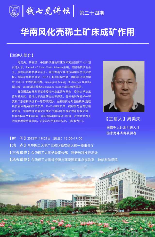 应核资源与环境国家重点实验室邀请,中国科学院地球化学研究所周美夫研究员来到“三亿体育(中国)官方网站”,以“华南风化壳稀土矿床成矿作用”为主题开展讲座。欢迎全校师生届时前往聆听。
