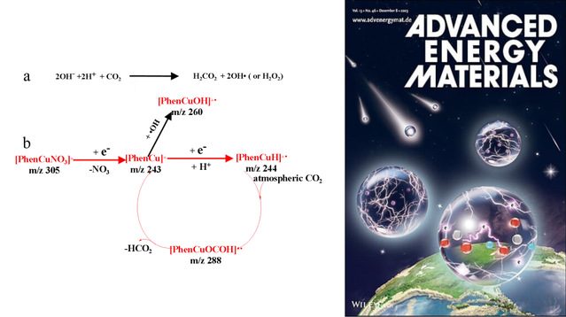 图1 微气液界面二氧化碳直接合成甲酸机理(左),AEM杂志封面图(右)