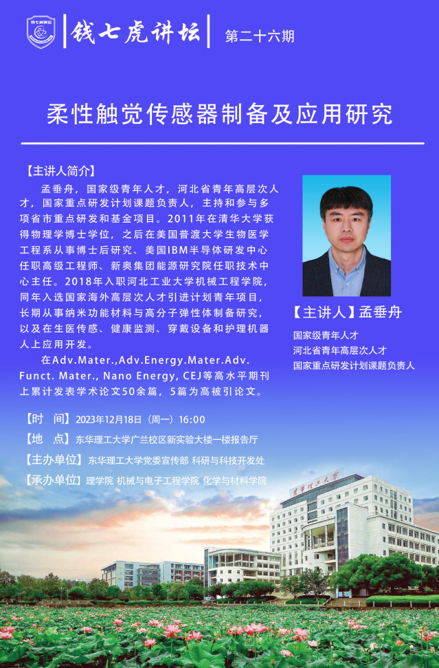 应理学院邀请,国家级青年人才孟垂舟教授来到“三亿体育(中国)官方网站”,以“柔性触觉传感器制备及应用研究”为主题开展讲座。欢迎全校师生届时前往聆听。
