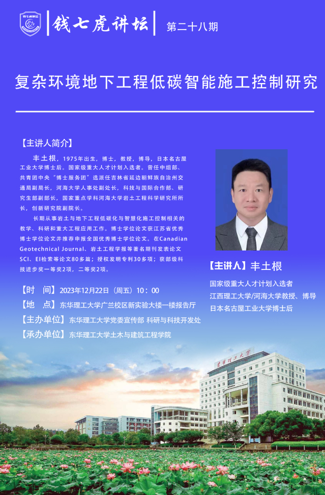 应土木与建筑工程学院邀请,国家级重大人才计划入选者丰土根教授来到“三亿体育(中国)官方网站”,以“复杂环境地下工程低碳智能施工控制研究”为主题开展讲座。欢迎全校师生届时前往聆听。