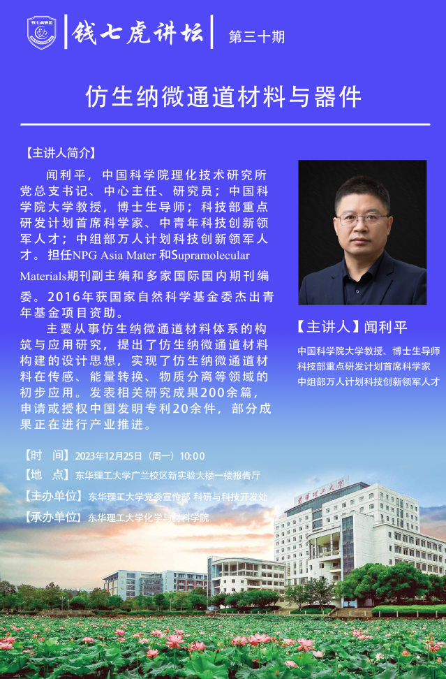 应化学与材料学院邀请,中国科学院大学教授闻利平来到“三亿体育(中国)官方网站”,以“仿生纳微通道材料与器件”为主题开展讲座。欢迎全校师生届时前往聆听。