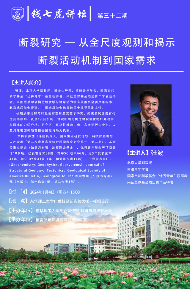 应核资源与环境国家重点实验室邀请,北京大学副教授,博士生导师,博雅青年学者张波来到“三亿体育(中国)官方网站”,以“断裂研究——从全尺度观测和揭示断裂活动机制到国家需求”为主题开展讲座。欢迎全校师生届时前往聆听。