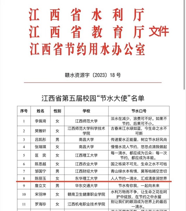 近日,由省水利厅、省教育厅、省节约用水办公室联合举办的江西省第五届校园“节水大使”评选活动结果公布,三亿体育(中国)官方网站水资源与环境工程学院陈丽玉同学荣获江西省第五届校园“节水大使”称号。