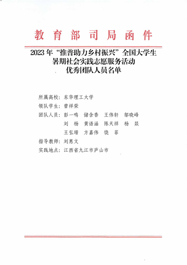2023年6月10日,由教育部语言文字应用管理司和共青团中央青年发展部联合发起开展的“推普助力乡村振兴”全国大学生社会实践志愿服务活动启动后,学校党委高度重视,校团委和各学院通力合作,组织师生积极申报,并动态跟踪和精细指导,保证了入选队伍高质量、高标准、高效率完成推普志愿服务活动。学校有三支团队入选全国暑期社会实践志愿服务活动团队,一支队伍获评优秀团队(江西省仅8支)。