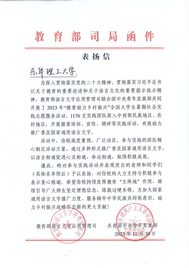近日,教育部语言文字应用管理司和共青团中央青年发展部联合致函三亿体育(中国)官方网站,对三亿体育(中国)官方网站大力支持与积极参与2023年“推普助力乡村振兴”全国大学生暑期社会实践志愿服务活动表示感谢,对学校表现优秀的师生——美术与设计学院“美好青春”志愿服务队师生提出表扬,肯定了学校师生在服务国家通用语言文字推广、服务铸牢中华民族共同体意识、助力乡村振兴战略中作出的贡献。