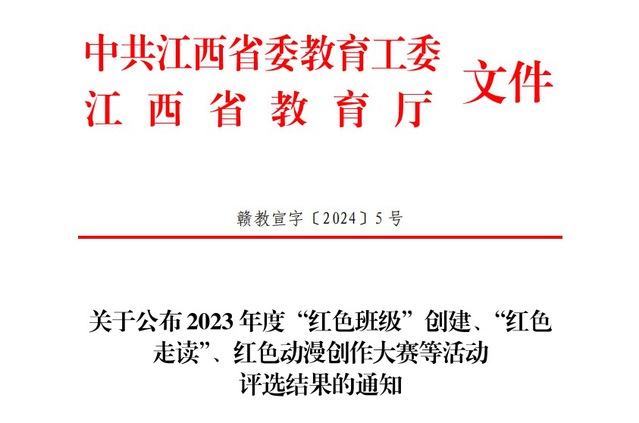 近日,江西省委教育工委、省教育厅公布了2023年度全省高校“红色班级”创建、“红色走读”、红色动漫创作大赛等活动评选结果,三亿体育(中国)官方网站获2023年全省高校优秀组织单位(全省10个),三亿体育(中国)官方网站“钱七虎”班入选2023年度全省高校“红色班级”创建试点班级(全省10个),“红色走读”实地走读分别获一、二、三等奖各1项,“红色走读”优秀“云游”作品获奖10项(全省排名第一),红色动漫创作大赛获一等奖1项(全省4个)。