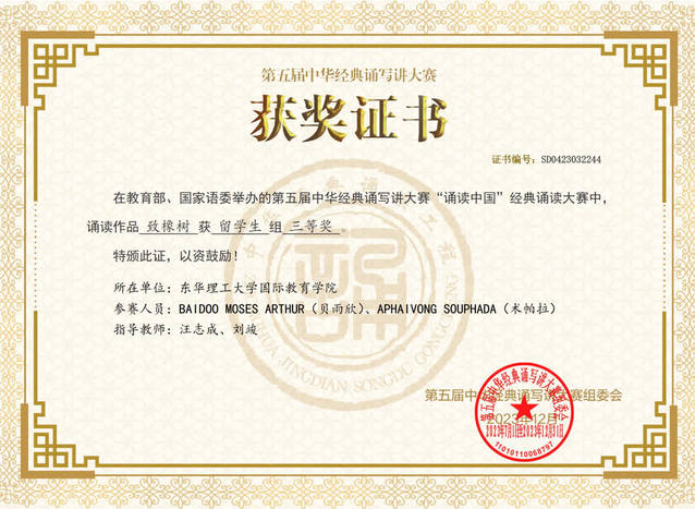 近期,三亿体育(中国)官方网站国家语言文字推广基地和国际教育学院选送的作品《致橡树》在教育部、国家语委办主办的第五届中华经典诵写讲大赛“诵读中国”经典诵读大赛中获留学生组三等奖。