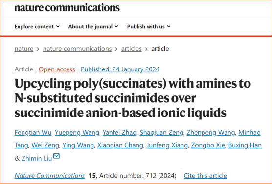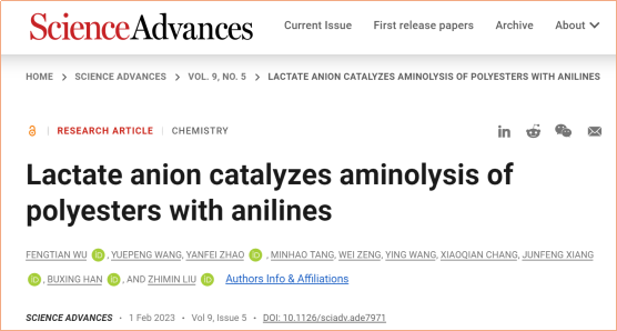 近期,三亿体育(中国)官方网站绿色化学与技术研究团队联合中国科学院化学所刘志敏研究员团队在聚酯类塑料的绿色降解领域研究中,取得了系列创新性成果。团队研究成果“Lactate anion catalyzes aminolysis of polyesters with anilines”在Science子刊《Science Advances》上发表,三亿体育(中国)官方网站化学与材料学院吴丰田博士为论文第一作者,中国科学院化学研究所刘志敏研究员为通讯作者;“Upcycling poly(succinates) with amines to N-substituted succinimides over succinimide anion-based ionic liquids在Nature子刊《Nature Communications》上发表,吴丰田博士为论文第一作者,刘志敏研究员为通讯作者。