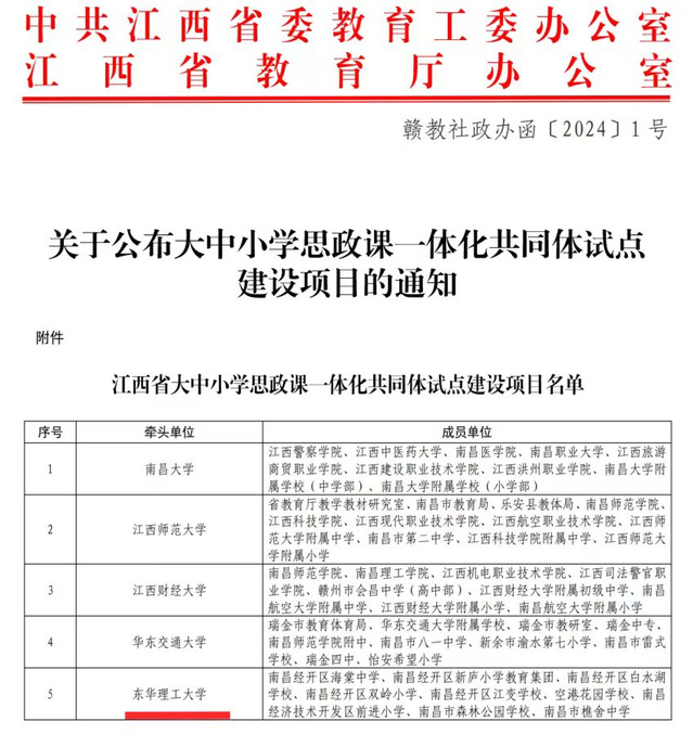 日前,中共江西省委教育工委、江西省教育厅正式公布了全省大中小学思政课一体化共同体试点建设项目评选结果,全省高校“一课多师”示范团队、“双师同堂”示范课堂、“师生同台”示范课评选结果,全省“大思政课”建设综合改革试验区改革项目评选结果,三亿体育(中国)官方网站获多项成果,标志着三亿体育(中国)官方网站思想政治理论课建设取得了显著成效。