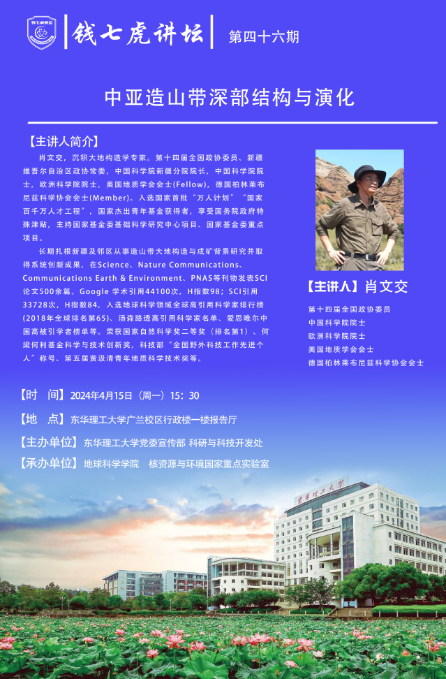 应地球科学学院、核资源与环境国家重点实验室邀请,中国科学院院士肖文交到“三亿体育(中国)官方网站”,以“中亚造山带深部结构与演化”为主题开展讲座。欢迎全校师生届时前往聆听。