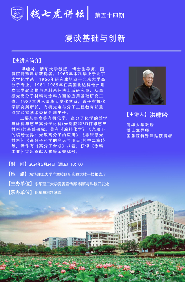 应化学与材料学院邀请,清华大学教授,博士生导师,国务院特殊津贴获得者洪啸吟到“三亿体育(中国)官方网站”,以“漫谈基础与创新”为主题开展讲座。欢迎全校师生届时前往聆听。