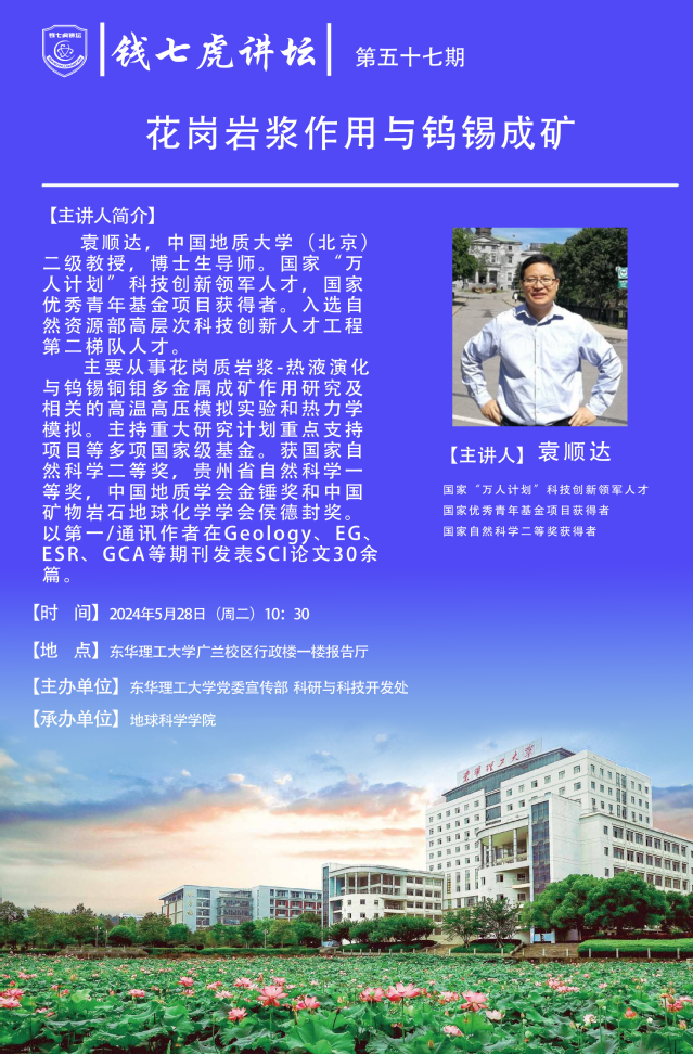 袁顺达,中国地质大学(北京),二级教授,博士生导师。国家级人才。主持重大研究计划重点支持项目等多项国家级基金。入选自然资源部高层次科技创新人才工程第二梯队人才。获国家自然科学二等奖,贵州省自然科学一等奖,中国地质学会金锤奖和中国矿物岩石地球化学学会侯德封奖。现任《地质通报》和《矿床地质》副主编。主要从事花岗质岩浆-热液演化与钨锡铜钼多金属成矿作用研究及相关的高温高压模拟实验和热力学模拟。以第一/通讯作者在Geology、EG、ESR、GCA等期刊发表SCI论文30余篇。