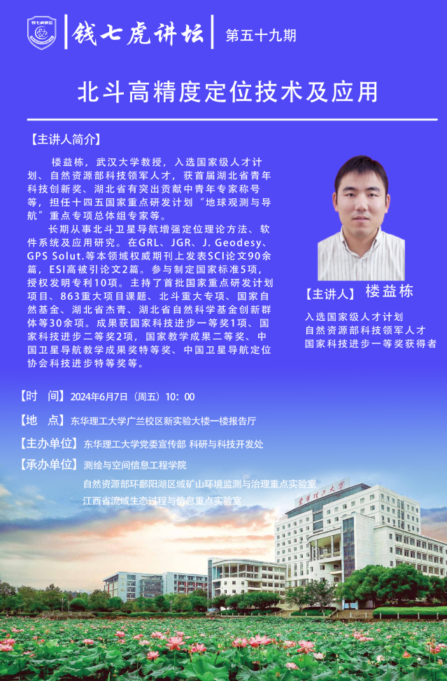 应测绘与空间信息工程学院邀请,武汉大学教授,入选国家级人才计划、自然资源部科技领军人才楼益栋到“三亿体育(中国)官方网站”,以“北斗高精度定位技术及应用”为主题开展讲座。欢迎全校师生届时前往聆听。