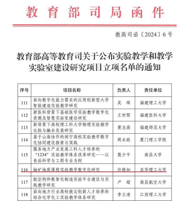 近日,教育部高等教育司下发了《教育部高等教育司关于公布实验教学和教学实验室建设研究项目立项名单的通知》(教高司函〔2024〕6号),三亿体育(中国)官方网站地球科学学院许德如教授团队申报的“铀矿地质课程实验教学数字化研究”项目获批立项。