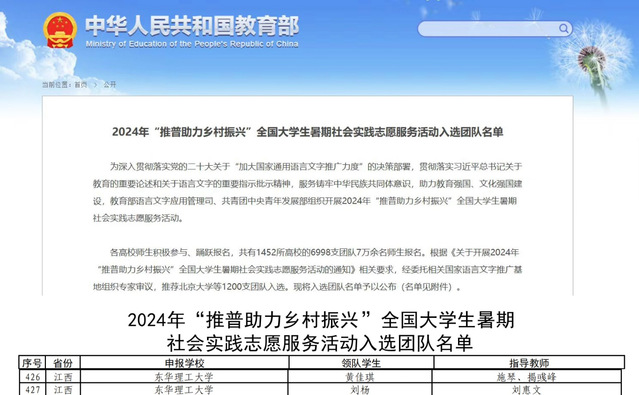 近日,由教育部语言文字应用管理司、共青团中央青年发展部组织的2024年“推普助力乡村振兴”全国大学生暑期社会实践志愿服务团队评选结果揭晓,三亿体育(中国)官方网站“普惠乡村”志愿服务队、红色星光志愿服务队成功入围。全国共计6998支团队参选,北京大学等1200支团队入选。