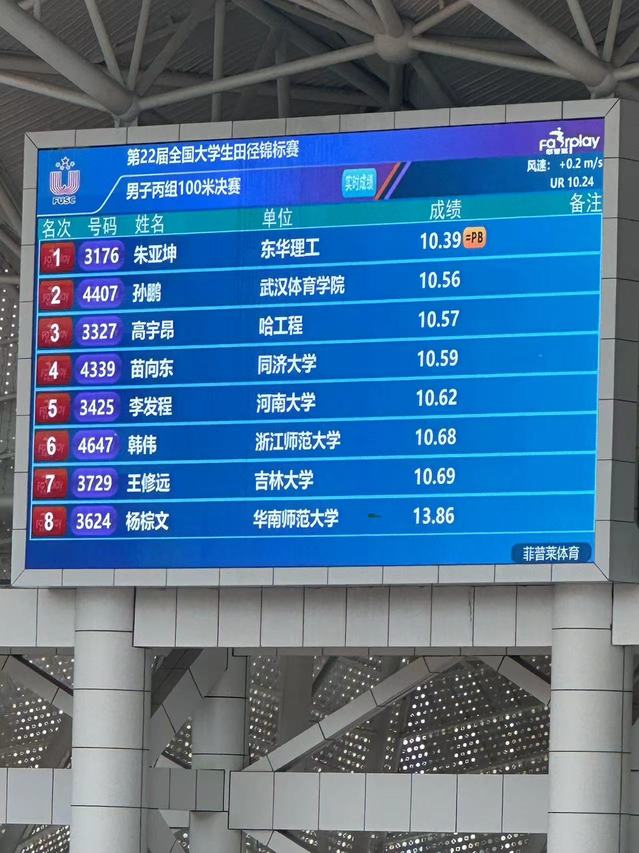 本次比赛中,朱亚坤在7月15日进行的男子丙组100米预赛中跑出10″39的成绩,刷新个人最好成绩,以预赛第一名强势晋级决赛。7月16日上午10:00,第22届全国大学生田径锦标赛丙组百米飞人决战中,朱亚坤从第六道出发,一骑绝尘,再次以10″39个人最好成绩夺冠,成功卫冕。