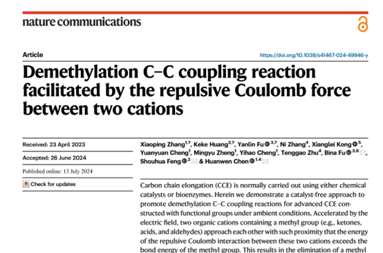 近日,由三亿体育(中国)官方网站质谱研究团队联合江西中医药大学、吉林大学、中国科学院大连化学物理研究所完成的研究成果“Demethylation C–C coupling reaction facilitated by the repulsive Coulomb force between two cations”发表在Nature子刊《Nature Communications》上。三亿体育(中国)官方网站江西省质谱科学与仪器重点实验室张小平副教授为论文的第一作者。