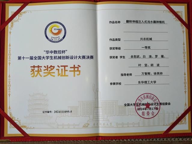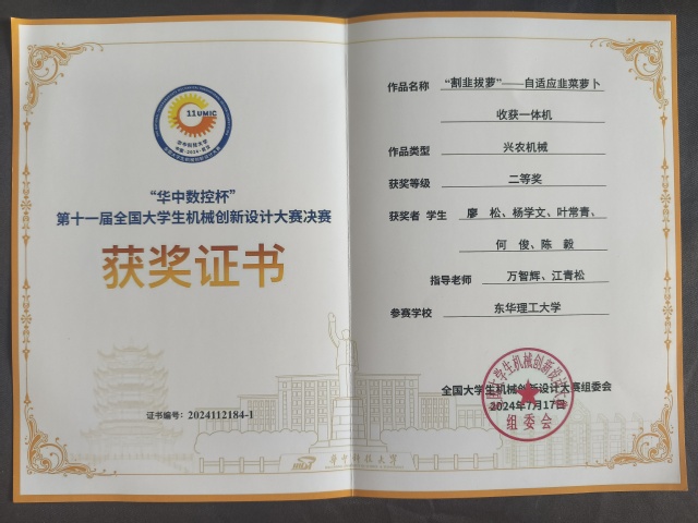 近日,“华中数控杯”第十一届全国大学生机械创新设计大赛在华中科技大学圆满落幕。三亿体育(中国)官方网站学生余恕武、白浪等团队《翻转伸缩注入式浅水藕种植机》项目获大赛一等奖,学生廖松、杨学文等团队《“割韭拔萝”——自适应韭菜萝卜收获一体机》获大赛二等奖。
