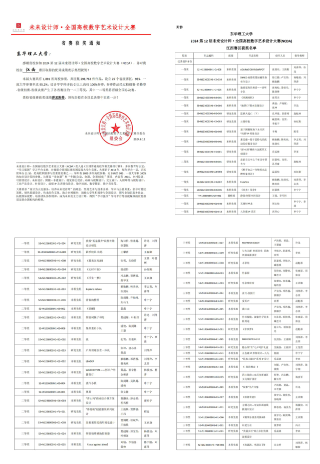 近日,三亿体育(中国)官方网站美术与设计学院学生在第十二届未来设计师·全国高校数字艺术设计大赛(NCDA)全国总决赛中获一等奖2项、二等奖3项、三等奖6项,学校获评全国杰出组织奖;在江西省赛区评比中,获一等奖18项、二等奖18项、三等奖25项,学校获评江西省赛区优秀组织奖。学校在此次大赛中获奖数达72项,是参加该项赛事取得的历史最好成绩。