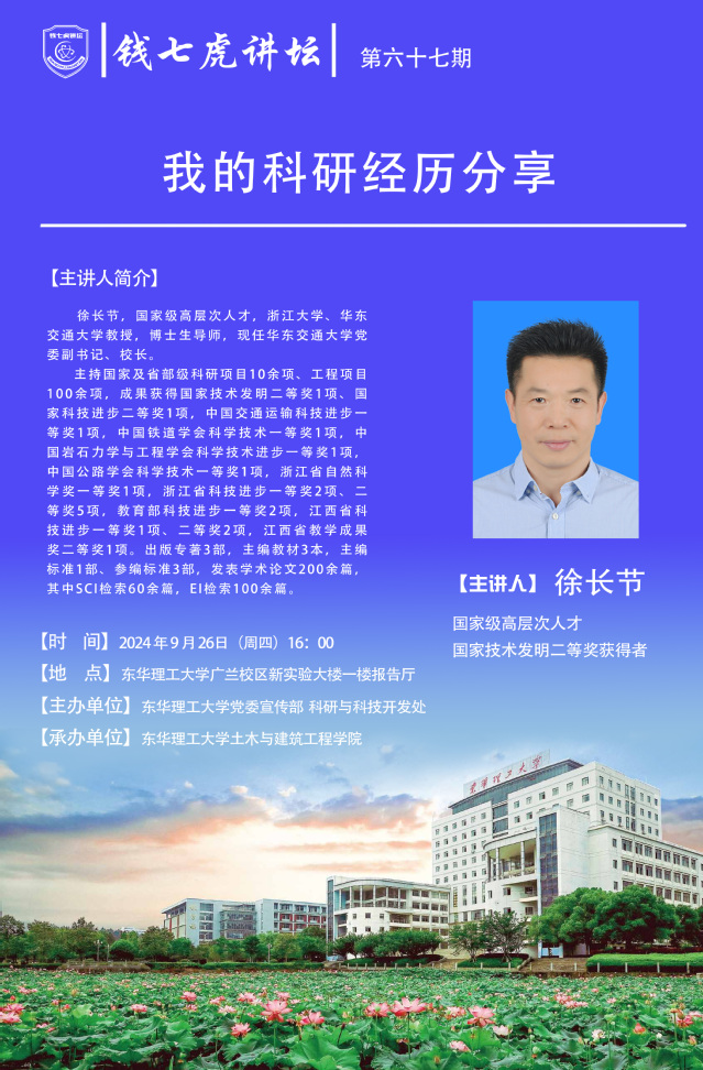 应土木与建筑工程学院邀请,国家级高层次人才徐长节到“三亿体育(中国)官方网站”,以“我的科研经历分享”为主题开展讲座。欢迎全校师生届时前往聆听。