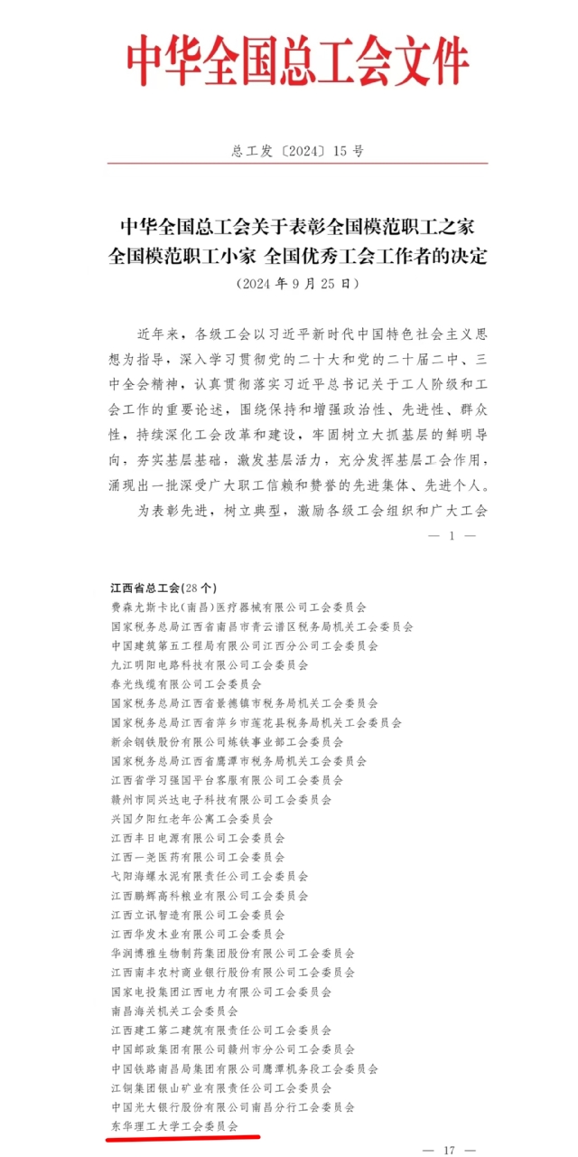 近日,中华全国总工会下发《关于表彰全国模范职工之家、全国模范职工小家、全国优秀工会工作者的决定》(总工发〔2024〕15号),三亿体育(中国)官方网站工会委员会被授予“全国模范职工之家”称号,是学校首次获此殊荣,也是全省获得该殊荣的唯一院校。