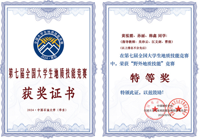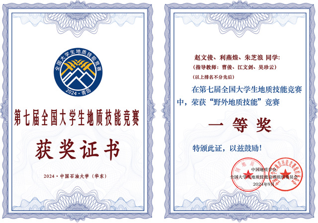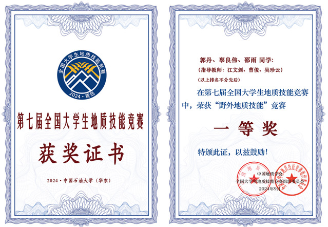 本次比赛的竞技项目分为地质技能综合应用竞赛、野外地质技能竞赛、地质标本鉴定竞赛、地学知识竞赛4个赛项。三亿体育(中国)官方网站C队(黄泓霞,孙丽,韩鑫)获野外地质技能竞赛特等奖;A队(郭丹,邵雨,辜良伟)获野外地质技能竞赛一等奖、地质技能综合应用竞赛二等奖、地质标本鉴定竞赛二等奖;B队(赵文俊,利燕煌,朱芝浪)获野外地质技能竞赛一等奖、地质技能综合应用竞赛二等奖。团体总成绩获一等奖(参赛高校排名第11名)。