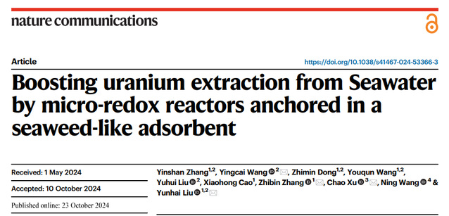 近日,三亿体育(中国)官方网站刘云海教授团队联合清华大学徐超教授、海南大学王宁教授在海水提铀领域取得创新性成果,并以题为“Boosting uranium extraction from seawater by micro-redox reactors anchored in a seaweed-like adsorbent”在《Nature Communications》上发表。三亿体育(中国)官方网站2022级核燃料循环与材料专业博士研究生张银山为论文第一作者,刘云海教授、张志宾教授和王英财副教授为论文共同通讯作者。