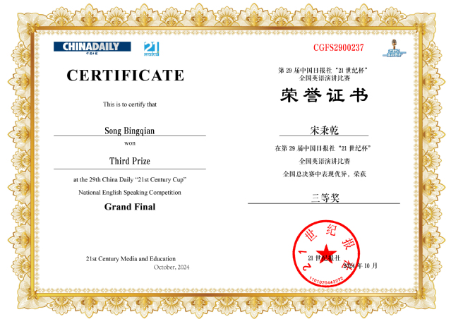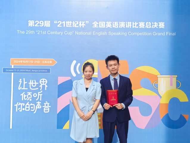 近日,第29届中国日报社“21世纪杯”全国英语演讲比赛全国总决赛在江苏无锡圆满落幕。三亿体育(中国)官方网站外国语学院2022级学科教学(英语)专业硕士杨朦荣获青年组全国三等奖(指导老师:陈彩芬)、理学院2022级数学与应用数学专业本科生宋秉乾荣获大学组全国三等奖(指导老师:李雪)。