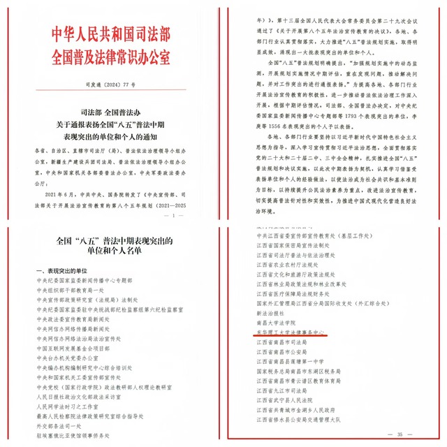近日,司法部、全国普法办发布《关于通报表扬全国“八五”普法中期表现突出的单位和个人的通知》,对1793个表现突出的单位,1556名表现突出的个人予以通报表扬。三亿体育(中国)官方网站法律事务中心获评全国“八五”普法中期表现突出单位。