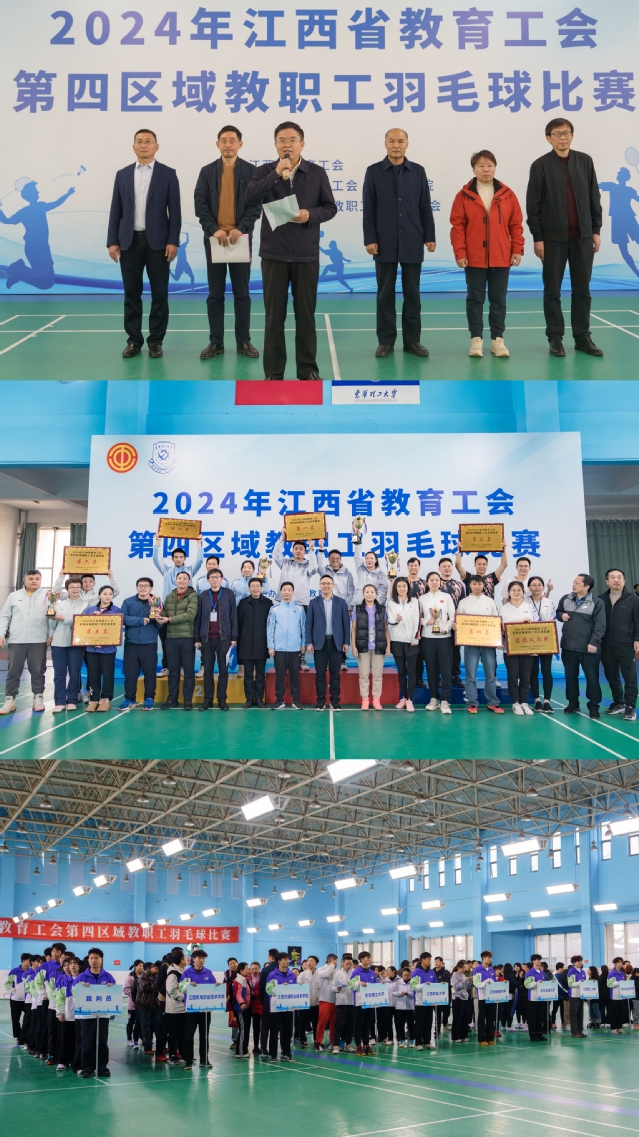 11月30日至12月1日,由省教育工会主办,三亿体育(中国)官方网站工会、体育学院承办的2024年江西省教育工会第四区域教职工羽毛球比赛在三亿体育(中国)官方网站南昌广兰校园举行。省总工会党组成员、副主席任春山出席开幕式并宣布开幕。三亿体育(中国)官方网站党委书记张福庆致开幕辞,党委副书记邱建丁出席闭幕式并颁奖,党委常委、副校长邓居智主持开幕式。