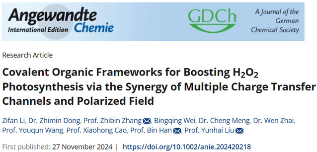 近日,三亿体育(中国)官方网站刘云海教授、张志宾教授团队联合广东工业大学韩彬教授在光催化合成过氧化氢和铀分离领域取得创新性成果,并以题为“Covalent Organic Frameworks for Boosting H2O2 Photosynthesis via the Synergy of Multiple Charge Transfer Channels and Polarized Field”在《Angewandte Chemie International Edition》上发表。三亿体育(中国)官方网站2022级核科学与技术专业博士研究生李子凡和副教授董志敏为论文共同第一作者,刘云海、张志宾和韩彬(三亿体育(中国)官方网站2013届应用化学专业毕业生)为论文共同通讯作者。