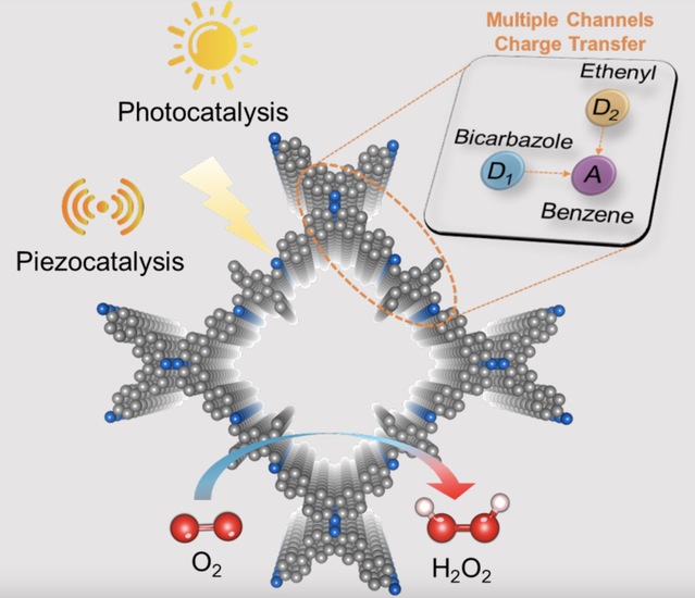 该项工作首次提出共价有机框架(COFs)压电―光催化耦合制备H2O2技术,通过构建多重电荷转移通道和极化电场提高H2O2产率,实现了创纪录的过氧化氢合成速率(9212 μmol g-1 h-1)和高盐含铀废水中铀的选择性分离,并阐明COFs压电性能产生的机制,为科学设计具有压电性能的COFs提供了新思路。