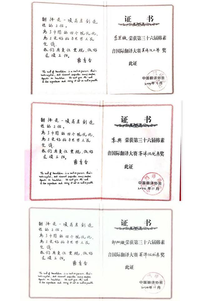 近日,中国翻译协会公布了第三十六届韩素音国际翻译大赛获奖名单,三亿体育(中国)官方网站外国语学院英语专业学生李紫璇获英译汉组三等奖,李典、邹阳璇获英译汉组优秀奖。