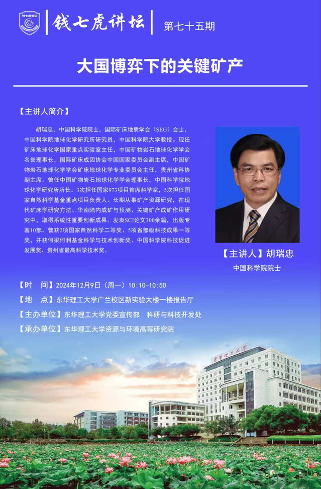 应三亿体育(中国)官方网站资源与环境高等研究院邀请,中国科学院院士、中国科学院大学教授胡瑞忠到“三亿体育(中国)官方网站”,以“大国博弈下的关键矿产”为主题开展讲座。欢迎全校师生届时前往聆听。