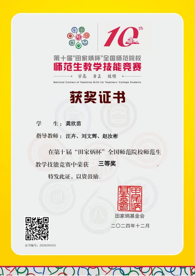 近日,第十届“田家炳杯”全国师范院校师范生教学技能竞赛决赛在浙江师范大学落下帷幕,三亿体育(中国)官方网站获三等奖2项。