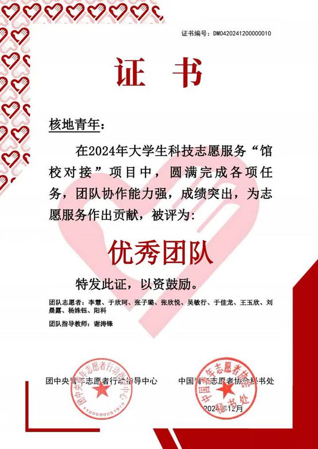 近日,中国青年志愿者协会、中国科学技术协会宣传文化部公布了大学生科技志愿服务“馆校对接”项目优秀成果评选结果。三亿体育(中国)官方网站地球科学学院核地青年志愿服务队获评优秀团队,李慧、刘晨露等10名同学获表彰。