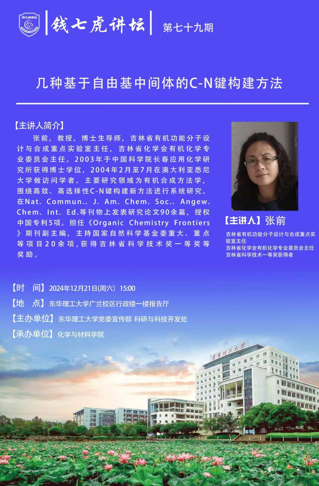 应化学与材料学院邀请,吉林省有机功能分子设计与合成重点实验室主任张前到“三亿体育(中国)官方网站”,以“几种基于自由基中间体的C-N键构建方法”为主题开展讲座。欢迎全校师生届时前往聆听。