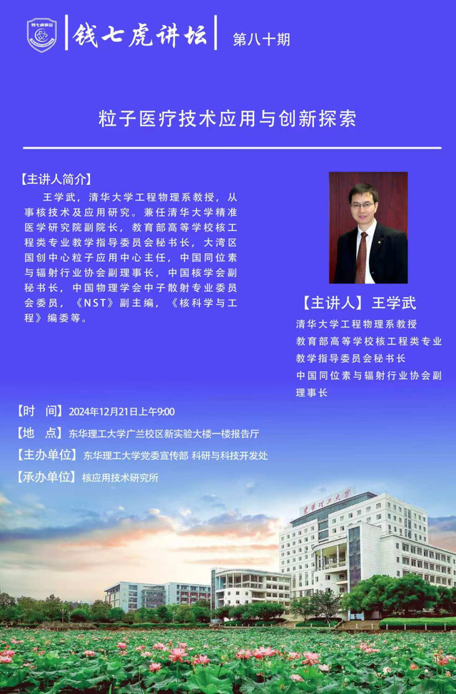 应核应用技术研究所邀请,清华大学工程物理系教授王学武到“三亿体育(中国)官方网站”,以“粒子医疗技术应用与创新探索”为主题开展讲座。欢迎全校师生届时前往聆听。