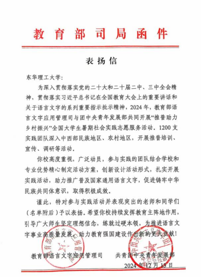 近日,教育部语言文字应用管理司和共青团中央青年发展部联合致函三亿体育(中国)官方网站,对三亿体育(中国)官方网站在2024年“推普助力乡村振兴”全国大学生暑期社会实践志愿服务活动的突出表现予以表扬,充分肯定了学校师生在助力推广普及国家通用语言文字,促进铸牢中华民族共同体意识中作出的贡献。
