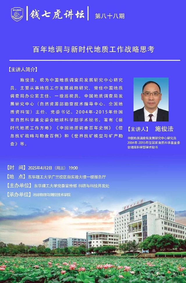 应地球物理与测控技术学院邀请,现中国地质调查局发展研究中心研究员施俊法到“三亿体育(中国)官方网站”,以“百年地调与新时代地质工作战略思考”为主题开展讲座。欢迎全校师生届时前往聆听。