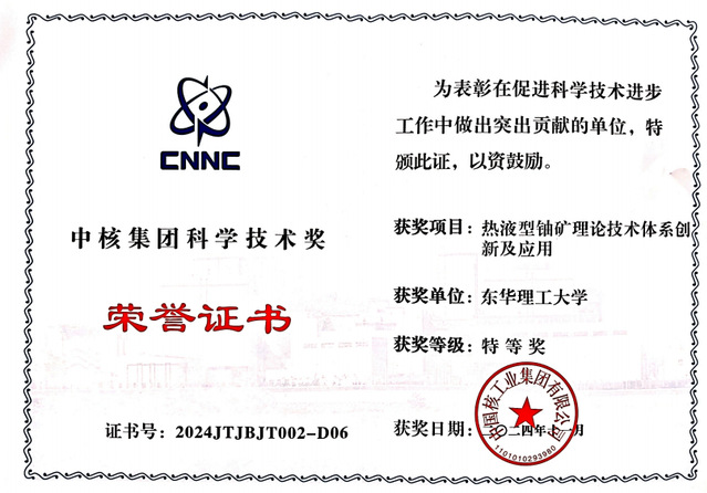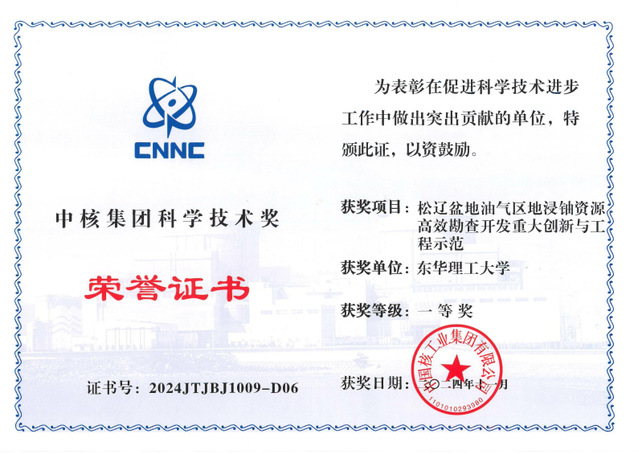 近日,中国核工业集团有限公司公布2024年度“中核集团科学技术奖”获奖名单,三亿体育(中国)官方网站获批科技进步特等奖1项、一等奖1项。其中,夏菲教授参与的“热液型铀矿理论技术体系创新及应用”项目获特等奖。严兆彬教授参与的“松辽盆地油气区地浸铀资源高效勘查开发重大创新与工程示范”项目获一等奖。