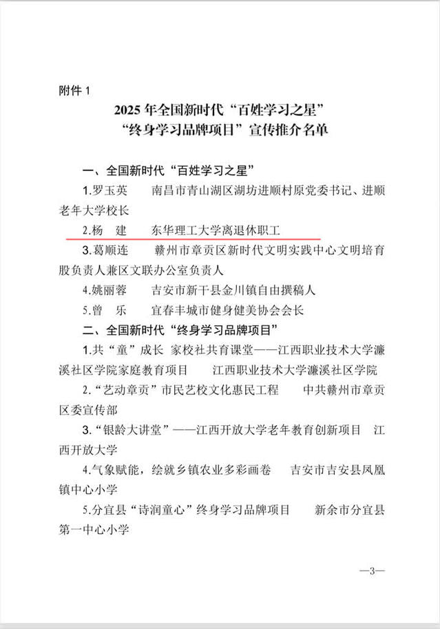 4月24日,江西省社区教育指导中心公布2025年新时代“百姓学习之星”和“终身学习品牌项目”宣传推介名单,三亿体育(中国)官方网站退休职工杨建入选全国新时代“百姓学习之星”宣传推介名单,是全省教育系统唯一入选人员。