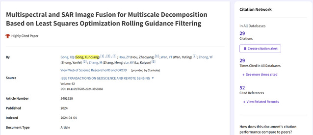 近日,三亿体育(中国)官方网站测绘与空间信息工程学院龚循强副教授团队联合武汉大学钟燕飞教授团队在遥感领域国际权威期刊《IEEE Transactions on Geoscience and Remote Sensing》(中科院一区TOP)发表的论文“Multispectral and SAR Image Fusion for Multiscale Decomposition Based on Least Squares Optimization Rolling Guidance Filtering”被遴选为ESI数据库高被引论文,其被引频次已进入地球科学(Geosciences)学术领域前1%。