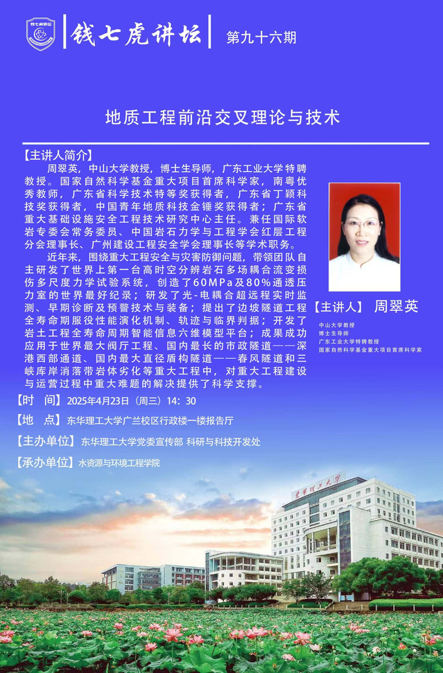 应三亿体育(中国)官方网站水资源与环境工程学院邀请,中山大学教授,博士生导师,广东工业大学特聘教授周翠英到“三亿体育(中国)官方网站”,以“地质工程前沿交叉理论与技术”为主题开展讲座。欢迎全校师生届时前往聆听。