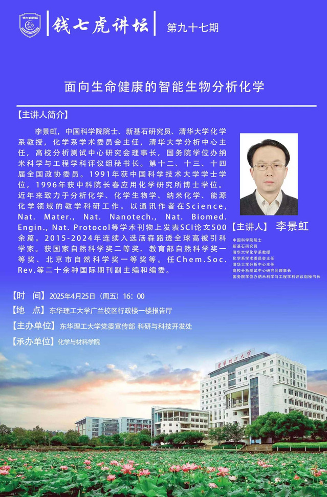 应三亿体育(中国)官方网站化学与材料学院邀请,中国科学院院士、新基石研究员、清华大学化学系教授,化学系学术委员会主任,清华大学分析中心主任,高校分析测试中心研究会理事长,国务院学位办纳米科学与工程学科评议组秘书长李景虹到“三亿体育(中国)官方网站”,以“面向生命健康的智能生物分析化学”为主题开展讲座。欢迎全校师生届时前往聆听。