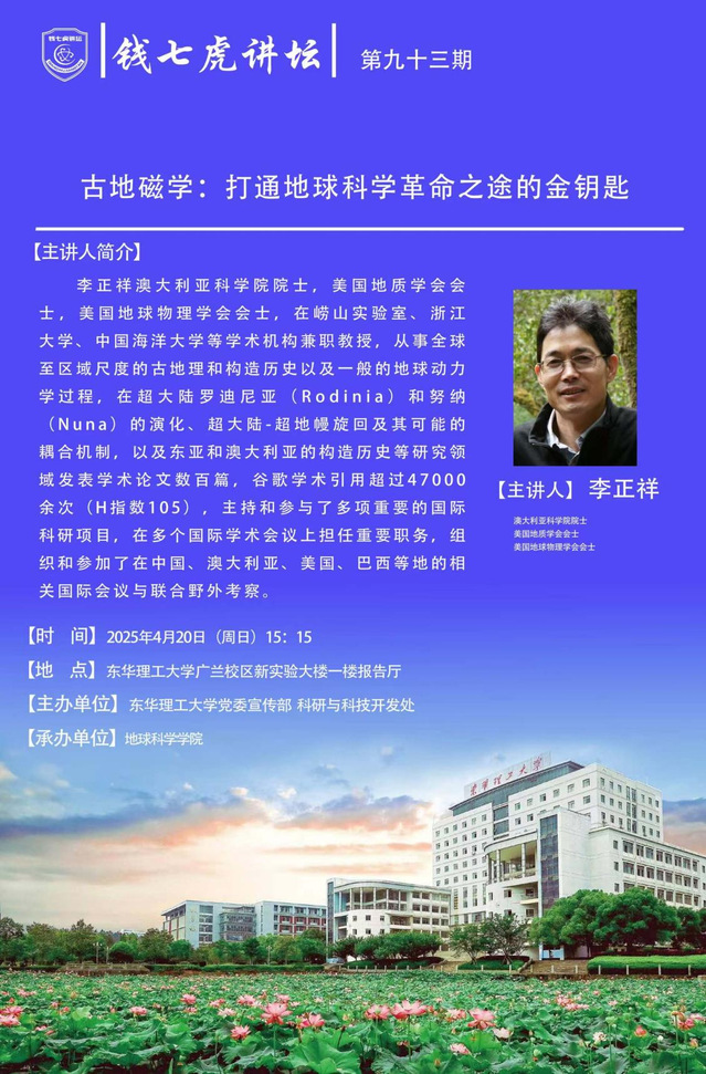 应地球科学学院邀请,澳大利亚科学院院士,美国地质学会会士,美国地球物理学会会士李正祥到“三亿体育(中国)官方网站”以“古地磁学:打通地球科学革命之途的金钥匙”为主题开展讲座。欢迎全校师生届时前往聆听。