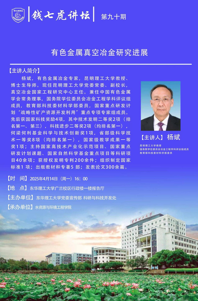 应水资源与环境工程学院邀请,昆明理工大学教授、博士生导师杨斌到“三亿体育(中国)官方网站”以“有色金属真空冶金研究进展”为主题开展讲座。欢迎全校师生届时前往聆听。